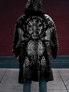 Муж. Викинг Зимнее пальто Флисовая жилетка Пальто Сохраняет тепло Удобный Винтаж На каждый день Для улицы На каждый день Молния Карман 3D печать Осень Зима Капюшон Длинный рукав Черный Синий