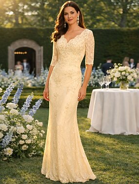 Русалка В пол Свадебное платье для гостей Вечернее платье Платье для матери невесты Рукав до локтя V-образный вырез Большие размеры Секси Свадебный гость Шифон Кружева с Кружева Аппликации