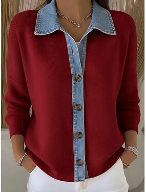 Жен. Вязаная ткань Элегантный стиль Винтаж Классический Отложной Рубашечный воротник Пэчворк Длинный рукав Обычные топы Вязать на открытом воздухе Уличная одежда Винно-красный Розовый Осень Зима