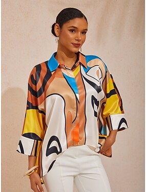 платье-рубашка из прямого атласа с геометрическим узором в стиле цветовых блоков для отпуска