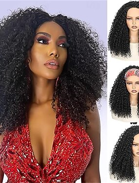 Синтетический парик шнурка Кудрявый Стиль 26 дюймовый Черный Средняя часть U-образный Парик Жен. Парик Черный