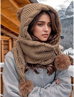 Женский рождественский вязаный шарф с капюшоном — уютная флисовая подкладка, помпоны, разноцветные варианты для зимней моды, идеально подходит для подарка на праздники и активного отдыха