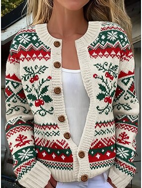 Жен. Рождественский свитер с узором Фэр-Айл Кардиган Мода Повседневные На каждый день Графика Рельефный узор Вырез под горло Пуговицы С принтом Длинный рукав Обычные топы Вязать