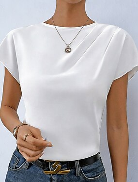 Жен. Рубашка Атласная блузка Сплошной цвет Полотняное плетение Элегантный стиль Мода На каждый день С короткими рукавами Вырез под горло Обычные топы Повседневные Уличная одежда Офис