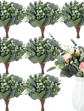 20 шт. смешанных листьев и стеблей эвкалипта, искусственные листья эвкалипта с белыми семенами, искусственные веточки эвкалипта в форме серебряной монеты, искусственные овальные листья для цветочных