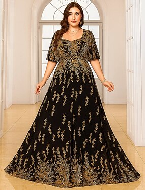 Платье A-Line длиной до пола для гостей на свадьбу Формальные платья Вечернее платье Платье для матери невесты Короткий рукав С открытыми плечами Элегантное Винтажное Плюс-сайз с пайетками
