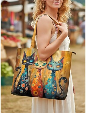 Женская полиэстеровая сумка-тоут, вместительная, на молнии, с различными изображениями кошек, идеально подходит для отдыха, покупок и повседневного использования.