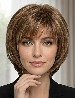 Стильный синтетический парик-каре для женщин — темно-коричневый с легкими мелированными прядями и гладкими слоями.