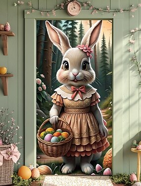 Пасхальный милый кролик в розовом платье держит корзинку с разноцветными яйцами, причудливый лесной баннер на дверь, дверная накладка на входную дверь, украшение для пасхального праздника.