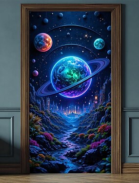 научно-фантастический космический пейзаж, городской пейзаж, дверной баннер, светящаяся синяя планета с кольцами, галактика, портал, футуристический пейзаж, дверная накладка для спальни, игровой