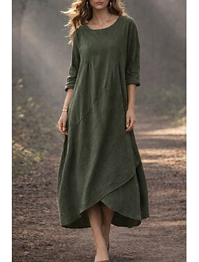 Женское миди-платье из льняной ткани похожей на искусственный хлопок свободного кроя повседневное с легким покроем простое с рукавом 3/4 круглым вырезом черное зеленое серое лето осень осень