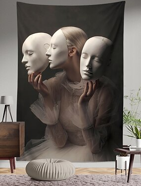 сюрреалистическая маска личности, искусство, женщина, держащая лица, настенный гобелен, темная, мрачная эстетика, уникальный готический декор для комнаты, спальни, гостиной, студии, фон для портрета в