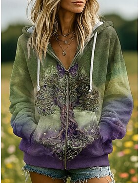 Женская 3D печать винтажного бохо худи патчворк худи свитшот цветочный на молнии повседневный капюшон стритстайл ежедневная носка патчворк карман на молнии светло-фиолетовый фиолетовый коричневый