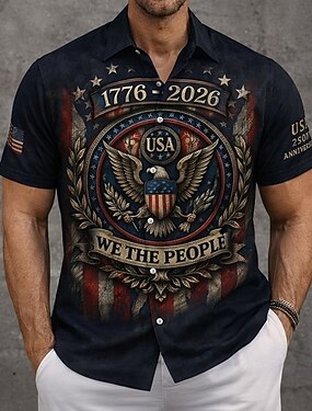 Муж. 4 июля — 250-летие США Орел Мы люди Рубашка Кнопка рубашка С короткими рукавами Патриот на открытом воздухе Праздники Лето Весна Отложной 3D печать рубашки с воротником Черный Темно-синий