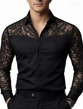 Муж. Рубашка Кнопка рубашка Выпускная рубашка Сплошной цвет Выпускной Свадьба Черный Длинный рукав Отложной Все сезоны Одежда Кружева