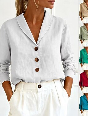 Женская блузка из льняной ткани похожей на фальшивый хлопок с пуговицами однотонная стильная casual с длинными рукавами V-образным вырезом регулярные топы повседневная синий белый желтый розовый