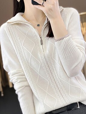Жен. Вязаная ткань Пуловер Мода На каждый день Чистый цвет Рельефный узор Половина молния Молния Трикотаж Длинный рукав Обычные топы Вязать на открытом воздухе Повседневные выходные Белый Осень Зима