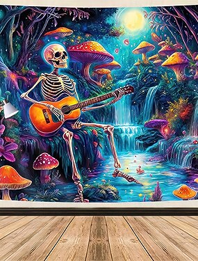 эстетичный скелет гитариста гобелен психоделическое свечение грибной лес настенное искусство психоделический водопад лунный свет фон для музыкальной комнаты студии