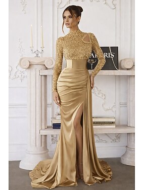 Русалка С коротким шлейфом Ниже колена Вечернее платье Бальное платье с верхней юбкой Торжественное платье Элегантный стиль Боковой разрез Шелковистость Длинный рукав Вырез под горло Официальные