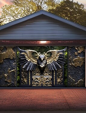 величественный черный золотой орел, богато украшенные золотые ворота, гаражные ворота, баннер, расправленные крылья, готическая архитектура, роскошная мраморная текстура, 3D-эффект, наружная роспись
