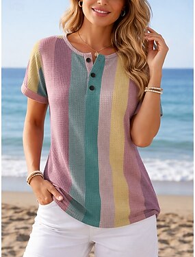 Жен. Футболка С принтом Кнопки на груди Геометрический принт Полоски Стиль Современное На каждый день С короткими рукавами Хенли Обычные топы Повседневные Синий Лето Весна