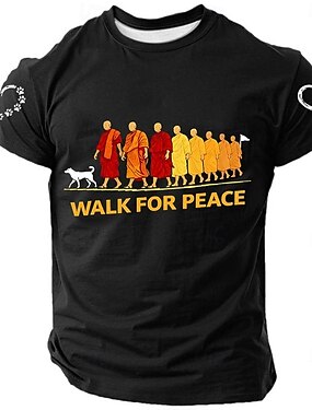 Мужская футболка "Прогулка за мир" с силуэтами собак и монахов "Алока", графическим изображением сердца, отпечатком лапы, буддийской тематикой, осознанностью, черная, с коротким рукавом, круглым