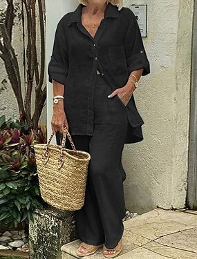 женские комплекты из хлопка и льна, комплекты из двух предметов, черный, белый, синий, простые на пуговицах, уличная повседневная мода, воротник рубашки, стандартный крой, s