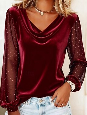 Новый год Жен. Бархат Горошек Элегантный стиль Винтаж Длинный рукав V-образный вырез Обычные топы Повседневные Свадебный гость Праздники Синий Черный Розовый Винный Золотой Осень Зима