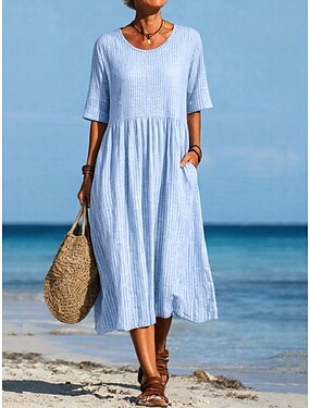 Жен. Платье средней длины Повседневное платье Платье A-силуэта Элегантный стиль Стиль На каждый день Повседневные Отпуск Свободное облегание Полоса С короткими рукавами Вырез под горло