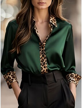 Жен. Атласная рубашка Рубашка Блуза Пэчворк Пуговицы С принтом Леопард Элегантный стиль Стиль На каждый день Длинный рукав Отложной Обычные топы Повседневные на открытом воздухе Уличная одежда