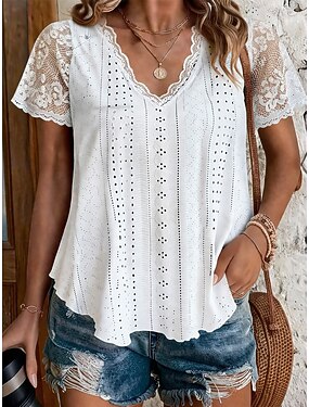 Жен. Топы в вафельном вязании Кружевная отделка Полотняное плетение Стиль Классика С короткими рукавами V-образный вырез Обычные топы Повседневные Синий Красный Светло-лиловый Лето Весна