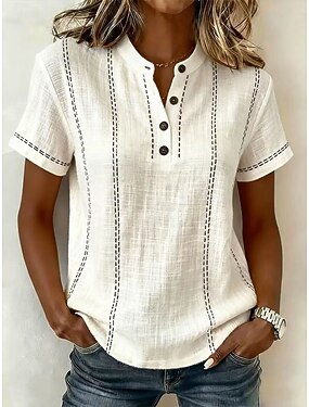Жен. Футболка Рубашка Хенли Пуговицы Полоски Мода С короткими рукавами Хенли Обычные топы Повседневные Пляж лето Белый Розовый Небесно-голубой Лето Весна