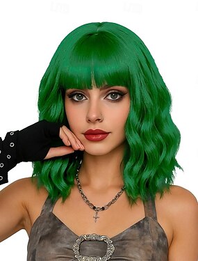 Темно-зеленые короткие парики с челкой для женщин свободные волнистые парики кудрявые волнистые плечевые бобы синтетические парики для косплея для девочек яркие костюмированные парики для Дня Святого