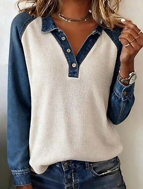 Жен. Рубашка Блуза Пэчворк Пуговицы Контрастных цветов Активный На каждый день Длинный рукав Рубашечный воротник Обычные топы Повседневные Праздники На выход Белый Осень Зима