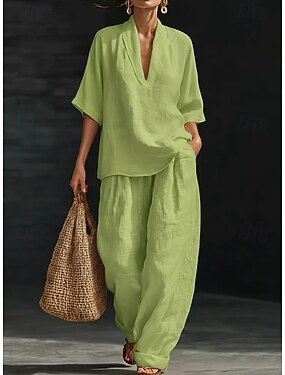 Жен. Комплекты хлопкового льна Комплекты брюк С короткими рукавами Вырез под горло Полотняное плетение Кулиска Активный Уличный стиль Повседневные на открытом воздухе Отпуск