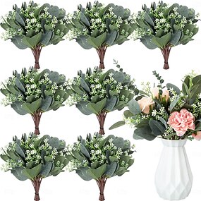 20 шт. смешанных листьев и стеблей эвкалипта, искусственные листья эвкалипта с белыми семенами, искусственные веточки эвкалипта в форме серебряной монеты, искусственные овальные листья для цветочных