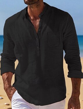 Муж. Рубашка Льняная рубашка Рубашка с воротником-стойкой Поповер Рубашка Летняя рубашка Одежда для пляжа Полотняное плетение Отпуск Праздники Черный Белый Желтый Винный Длинный рукав Хенли Лето Весна
