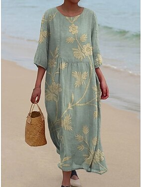 Женское макси-платье из льняного материала воздухопроницаемое легкое кафтан с рукавом 3/4 круглый вырез повседневное сдвиг платья платье в форме буквы А богемное повседневные для отдыха свиданий