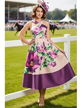 А-силуэт Ниже колена коктейльные платья Элегантный стиль Винтаж С цветами С короткими рукавами Вырез под горло Вечеринка в саду Свадьба Карман Сатин Вырез с драпировкой на спине с