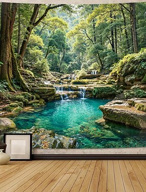 Умиротворяющий пейзаж с лесным ручьем, каскадными водопадами и кристально чистым прудом — успокаивающее настенное украшение для дома, идеально подходящее для спальни или гостиной.