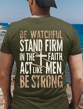 Мужская футболка с надписью «Будьте бдительны, стойте твердо в вере, ведите себя как мужчины, будьте сильны», с принтом креста на спине и библейским стихом, коротким рукавом, стандартного кроя,