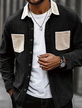 Муж. Куртка-рубашка Вельветовый пиджак Повседневная куртка Отпуск Повседневные Дышащий Карман Весна Осень Контрастных цветов Мода Классика Лацкан Обычная Черный Военно-зеленный Серый Жакеты