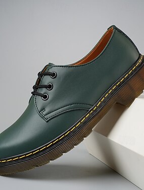 Мужские зеленые туфли дерби из искусственной кожи – классическая модель со шнуровкой и желтым акцентом, идеально подходят для элегантного повседневного стиля и полуофициальных мероприятий.