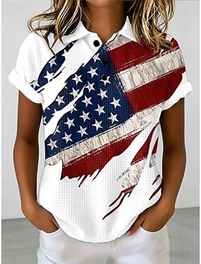 День независимости США Жен. Рубашки-поло из вафельной ткани Графика Флаг Винтаж Стиль Классика С короткими рукавами Воротник-поло Обычные топы Повседневные Белый Красный Лето Весна