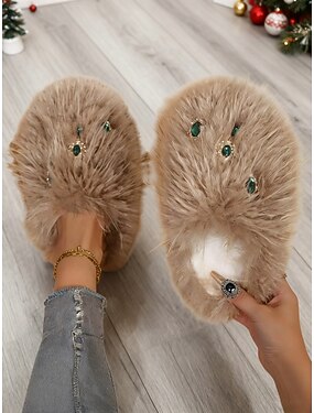 Женские пушистые меховые тапочки с отделкой из драгоценных камней – теплая и уютная зимняя домашняя обувь для женщин, мягкий плюш, подарок на Рождество