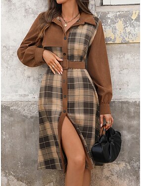 Жен. Мини-платье Платье A-силуэта На каждый день Повседневные Стандартный В клетку Длинный рукав Лацкан Коричневый Темно-серый Абрикосовый Весна Осень Зима