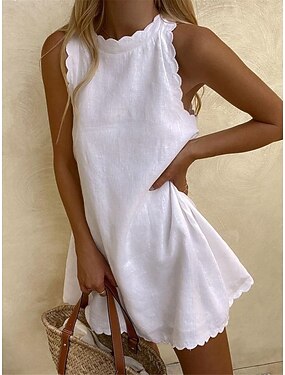 Жен. Мини-платье Белое платье Платье на выпускной Платье из хлопка и льна Сарафан Классический На каждый день Повседневные Отпуск Свидание Стандартный Полотняное плетение Без рукавов Вырез под горло