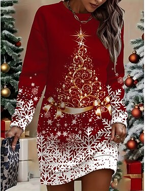 Новогодняя тематика Жен. Мини-платье Платье-свитер Платье прямого кроя Отпуск На каждый день День рождения Свидание Стандартный Графика Новогодняя ёлка В снежинку Длинный рукав Вырез под горло Красный