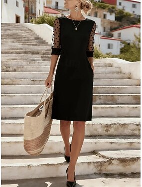 Жен. Мини-платье Платье A-силуэта Платье-футляр На каждый день Офис Стандартный Горошек Рукав до локтя Вырез под горло Черный Лето Весна Осень
