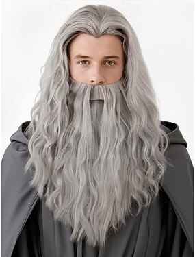 Длинный седой парик для мужчин, комплект париков и бороды для косплея Санты-волшебника на Хэллоуин